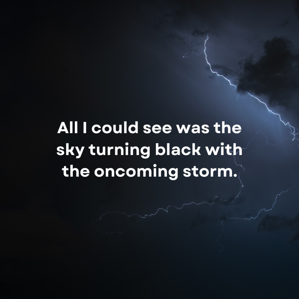 Posted on August 20, 2023August 19, 2023 by Erin Klitzke365 Days of Prompts – August 20 Write a scene with the opening line “All I could see was the sky turning black with the oncoming storm.” Liked it? Take a second to support Erin Klitzke on Patreon!Share this: Click to share on Facebook (Opens in new window) Facebook Click to share on X (Opens in new window) X Click to share on Tumblr (Opens in new window) Tumblr Click to email a link to a friend (Opens in new window) Email Click to print (Opens in new window) Print More Click to share on Pocket (Opens in new window) Pocket Click to share on Reddit (Opens in new window) Reddit Click to share on WhatsApp (Opens in new window) WhatsApp Click to share on Telegram (Opens in new window) Telegram Click to share on LinkedIn (Opens in new window) LinkedIn Like this:Like Loading...