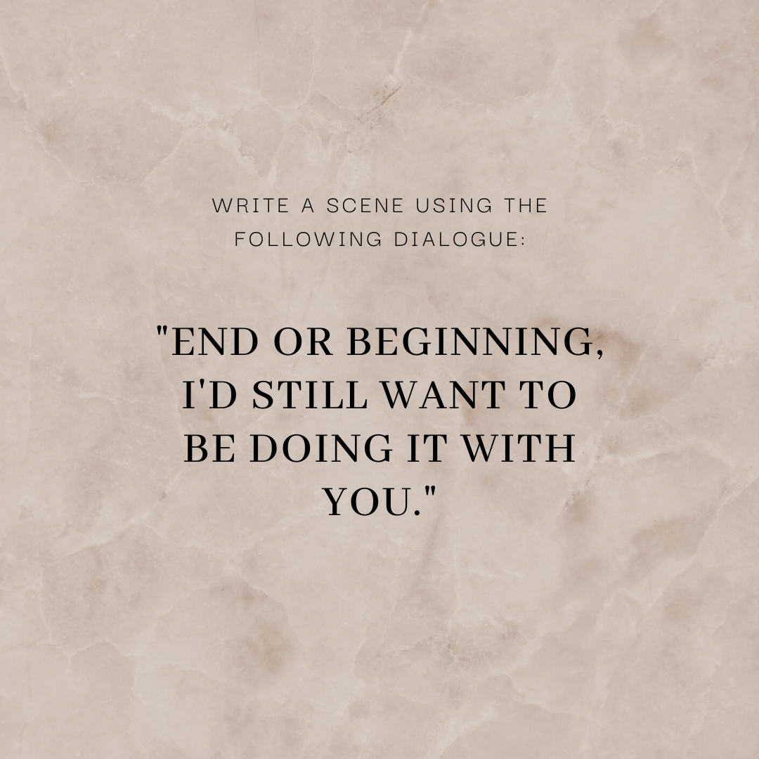 Posted on January 6, 2023January 5, 2023 by Erin Klitzke365 Days of Prompts – January 6 Write a scene using the dialogue: “End or beginning, I’d still want to be doing it with you.” Liked it? Take a second to support Erin Klitzke on Patreon!Share this: Click to share on Facebook (Opens in new window) Facebook Click to share on X (Opens in new window) X Click to share on Tumblr (Opens in new window) Tumblr Click to email a link to a friend (Opens in new window) Email Click to print (Opens in new window) Print More Click to share on Pocket (Opens in new window) Pocket Click to share on Reddit (Opens in new window) Reddit Click to share on WhatsApp (Opens in new window) WhatsApp Click to share on Telegram (Opens in new window) Telegram Click to share on LinkedIn (Opens in new window) LinkedIn Like this:Like Loading...