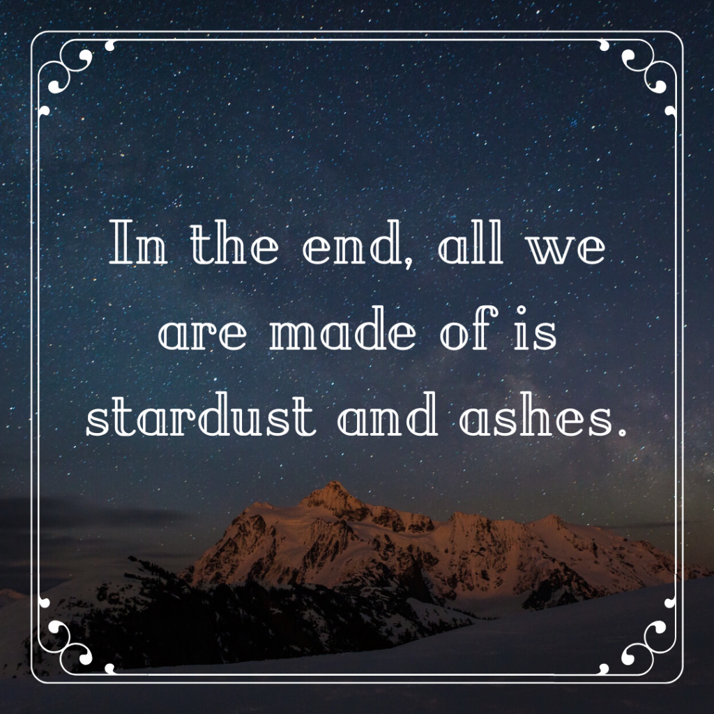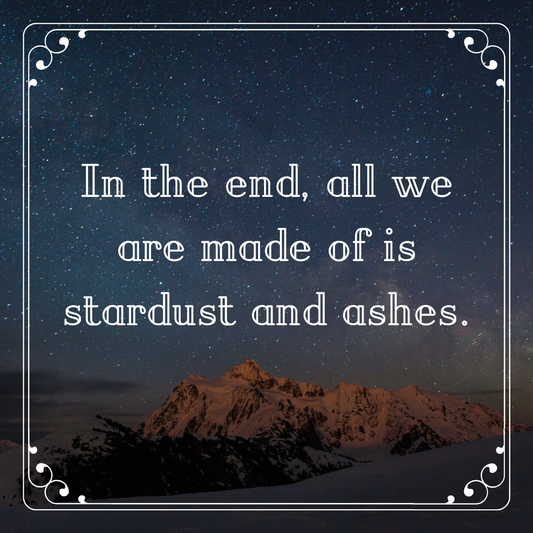 Posted on July 15, 2023July 9, 2023 by Erin Klitzke365 Days of Prompts – July 15 Write a scene with the opening line: “In the end, all we are made of is stardust and ashes.” Liked it? Take a second to support Erin Klitzke on Patreon!Share this: Click to share on Facebook (Opens in new window) Facebook Click to share on X (Opens in new window) X Click to share on Tumblr (Opens in new window) Tumblr Click to email a link to a friend (Opens in new window) Email Click to print (Opens in new window) Print More Click to share on Pocket (Opens in new window) Pocket Click to share on Reddit (Opens in new window) Reddit Click to share on WhatsApp (Opens in new window) WhatsApp Click to share on Telegram (Opens in new window) Telegram Click to share on LinkedIn (Opens in new window) LinkedIn Like this:Like Loading...