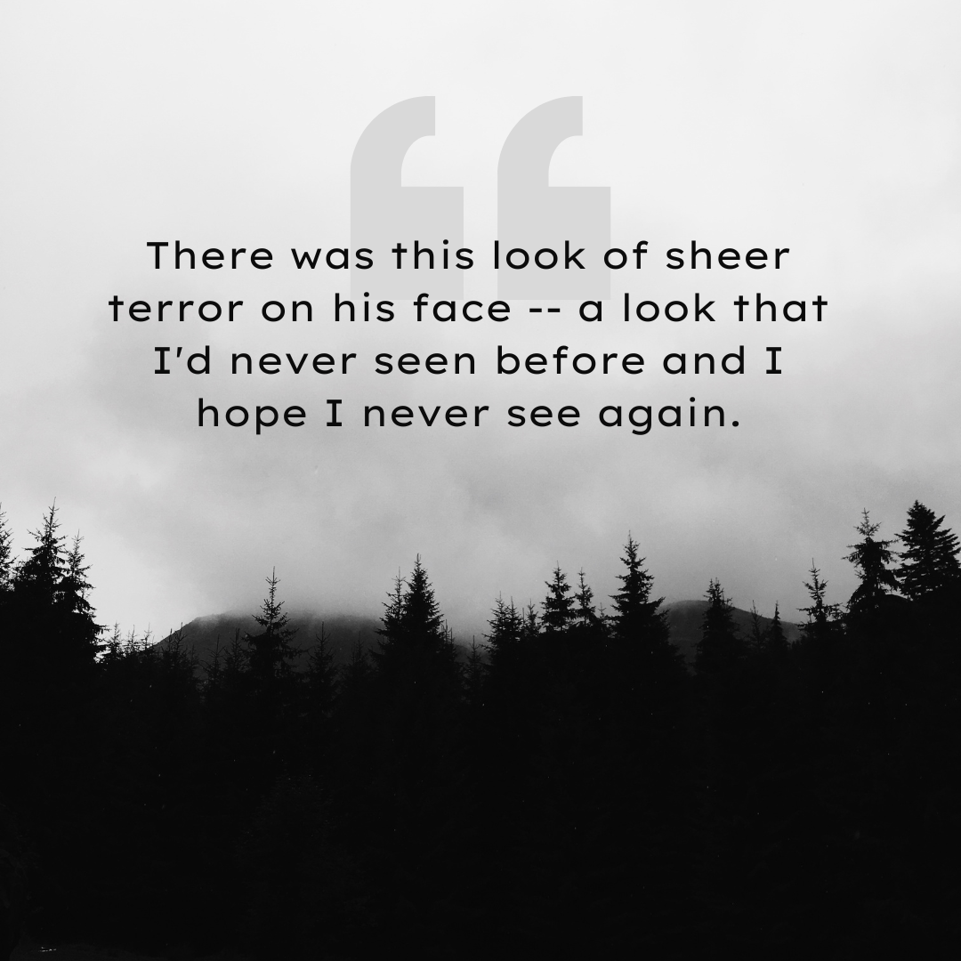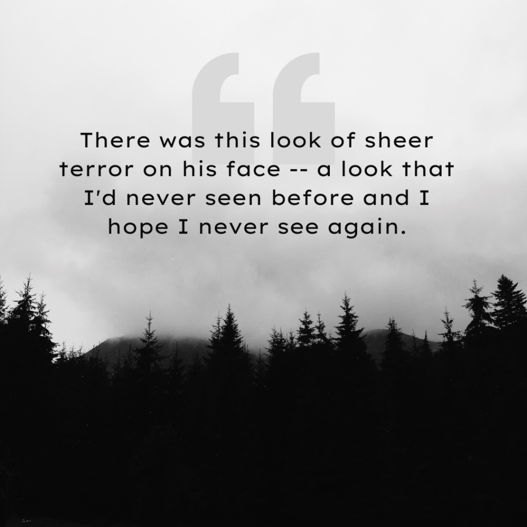 Write a scene with the opening line “There was this look of sheer terror on his face — a look that I’d never seen before and I hope I never see again.”