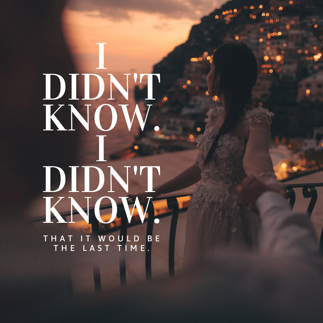 Posted on March 9, 2023March 5, 2023 by Erin Klitzke365 Days of Prompts – March 9 Write a scene with the opening line: “I didn’t know. I didn’t know. That it would be the last time.” Liked it? Take a second to support Erin Klitzke on Patreon!Share this: Click to share on Facebook (Opens in new window) Facebook Click to share on X (Opens in new window) X Click to share on Tumblr (Opens in new window) Tumblr Click to email a link to a friend (Opens in new window) Email Click to print (Opens in new window) Print More Click to share on Pocket (Opens in new window) Pocket Click to share on Reddit (Opens in new window) Reddit Click to share on WhatsApp (Opens in new window) WhatsApp Click to share on Telegram (Opens in new window) Telegram Click to share on LinkedIn (Opens in new window) LinkedIn Like this:Like Loading...
