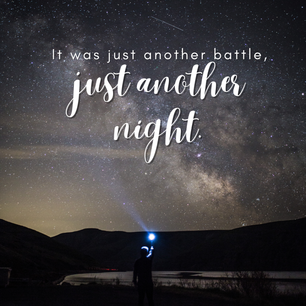 Posted on October 24, 2023October 23, 2023 by Erin Klitzke365 Days of Prompts – October 24 Write a scene with the opening line “It was just another battle, just another night.” Liked it? Take a second to support Erin Klitzke on Patreon!Share this: Click to share on Facebook (Opens in new window) Facebook Click to share on X (Opens in new window) X Click to share on Tumblr (Opens in new window) Tumblr Click to email a link to a friend (Opens in new window) Email Click to print (Opens in new window) Print More Click to share on Pocket (Opens in new window) Pocket Click to share on Reddit (Opens in new window) Reddit Click to share on WhatsApp (Opens in new window) WhatsApp Click to share on Telegram (Opens in new window) Telegram Click to share on LinkedIn (Opens in new window) LinkedIn Like this:Like Loading...