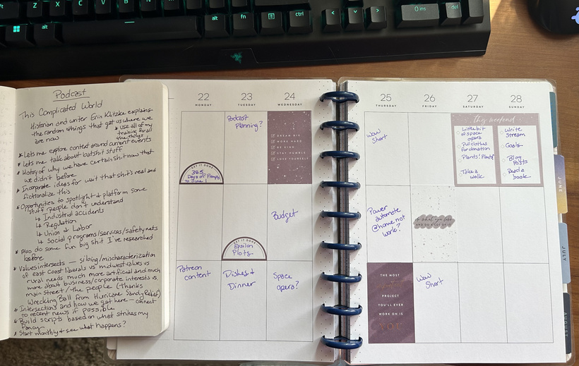 Lots of randomness there in the planner for next week, right? One of the things I’m trying to do is actually using the lovely planner that I have for things that I want to do outside of my day job (day job has its own undated daily planner which I’ll refrain from subjecting you to). Some things, of course, will have nothing to do with writing (as you can clearly see). Some things, of course, will.