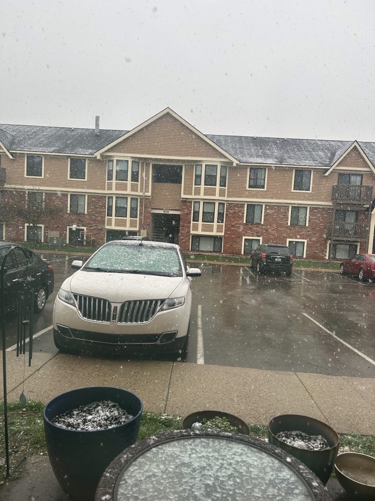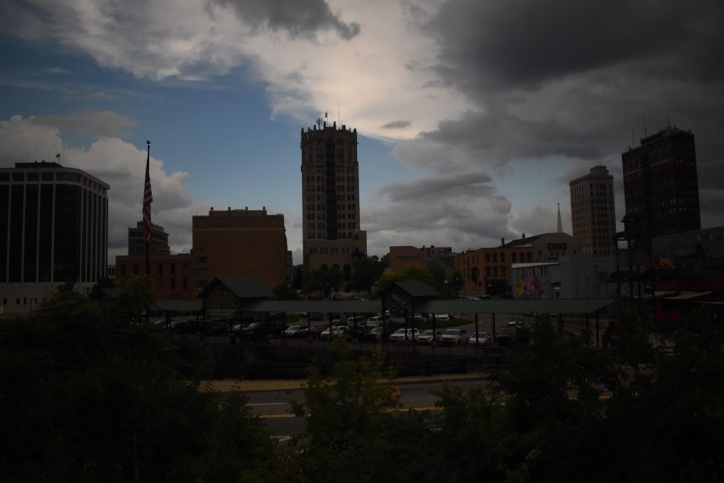 Rainbow against a dark sky over an apartment building front lit by the sun.