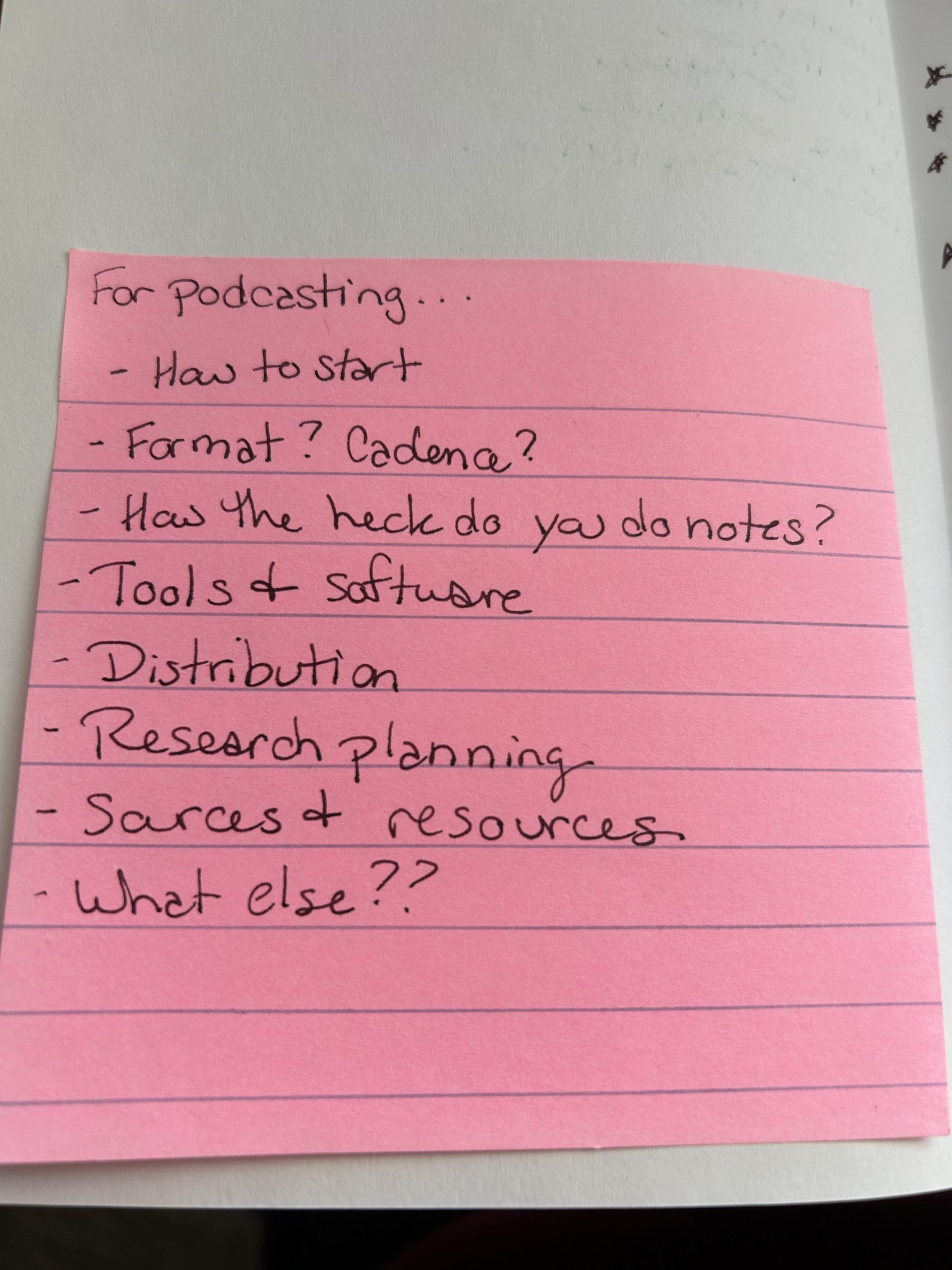 Instead of just gathering ideas and intending to someday start a podcast, I’m actually going to concretely start to figure out how to do this, plan it, and get rolling.
